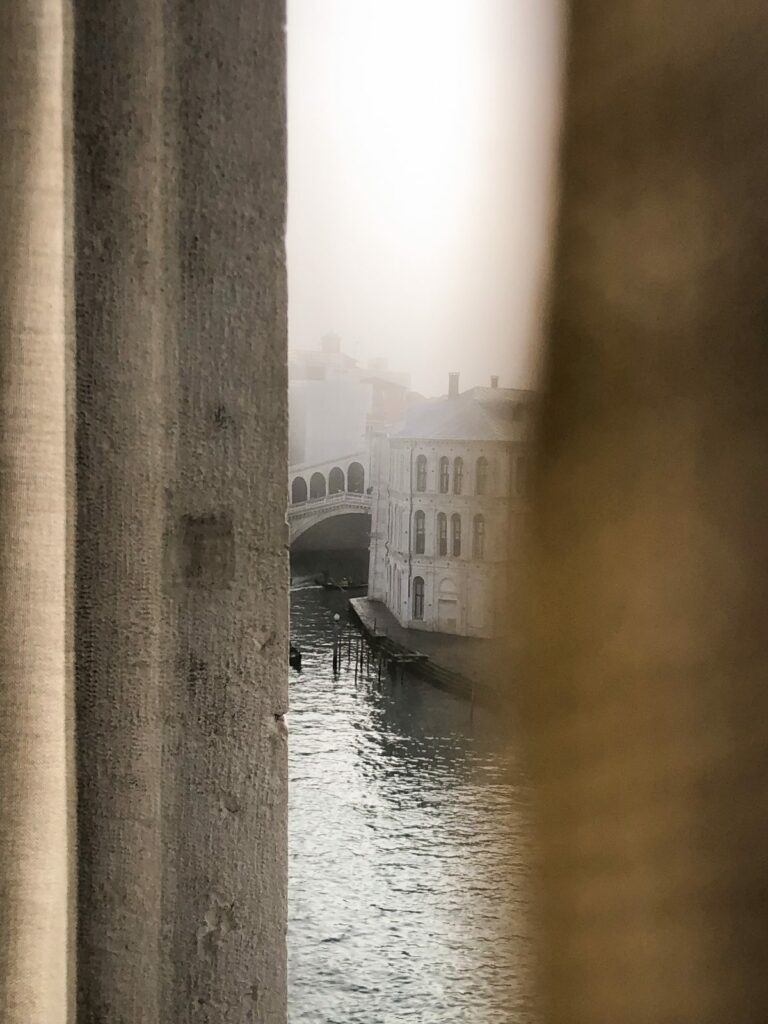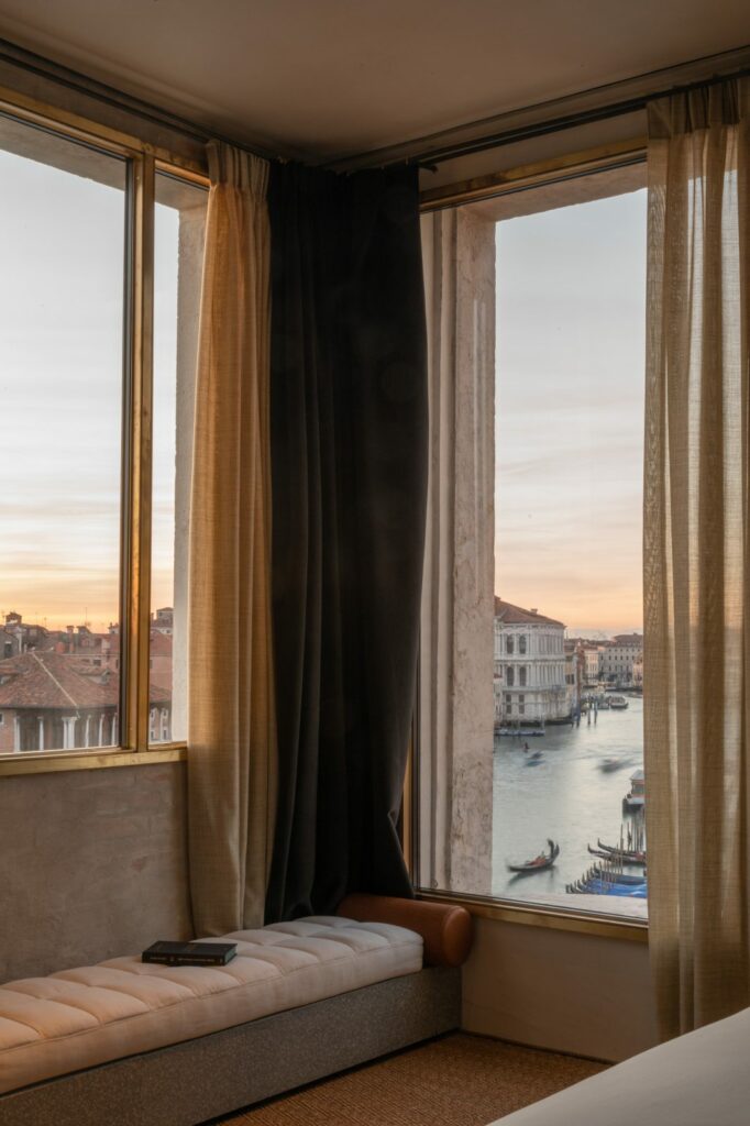 THROUGH SCENOGRAPHIC WINDOWS: THE ARCHITECTURAL SOUL OF A VENICE THIRSTY FOR LIGHT. THE ICONIC RIALTO BRIDGE COMPETES SPECTACULARLY WITH AN EQUALLY EXTRAORDINARY VIEW, SO EXPANSIVE IT APPEARS ENDLESS. A REMARKABLE STRETCH OF THE GRAND CANAL IS INSCRIBED IN THE UNFORGETTABLE FRAME OF THE FULL CORNER WINDOW, INVITING THE VIEWER TO ENTER INTO THE VIBRANT DAILY LIFE OF THE VENETIANS.
