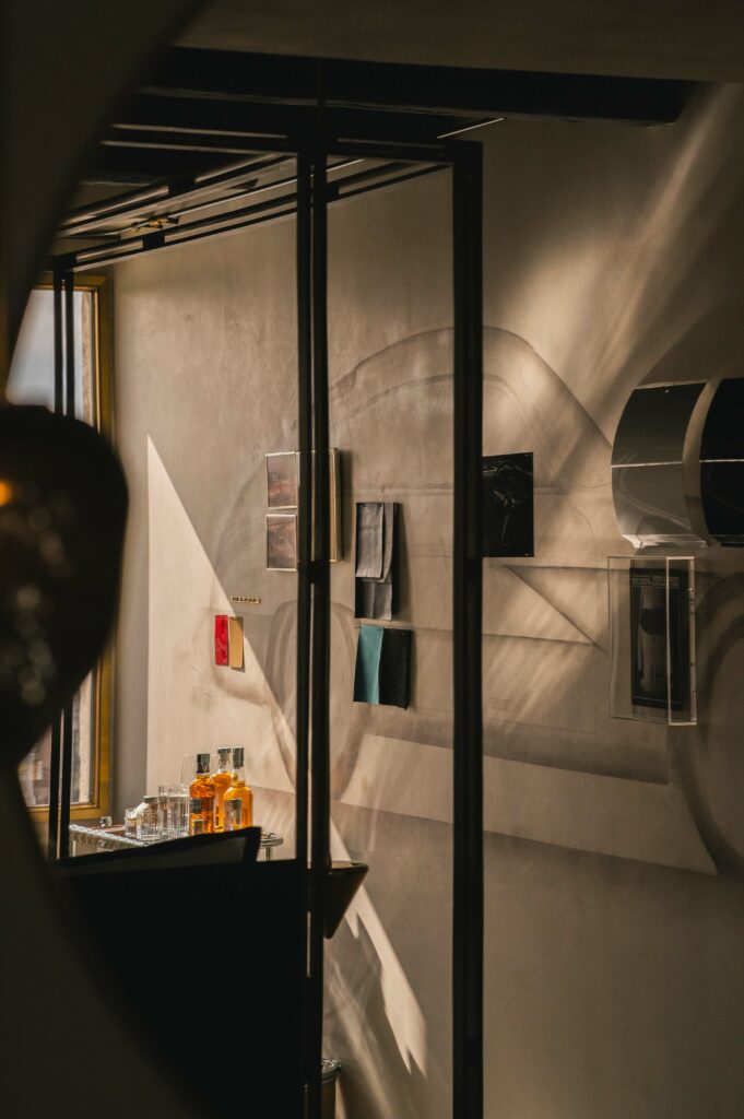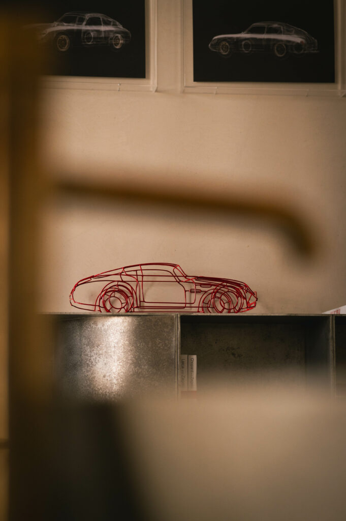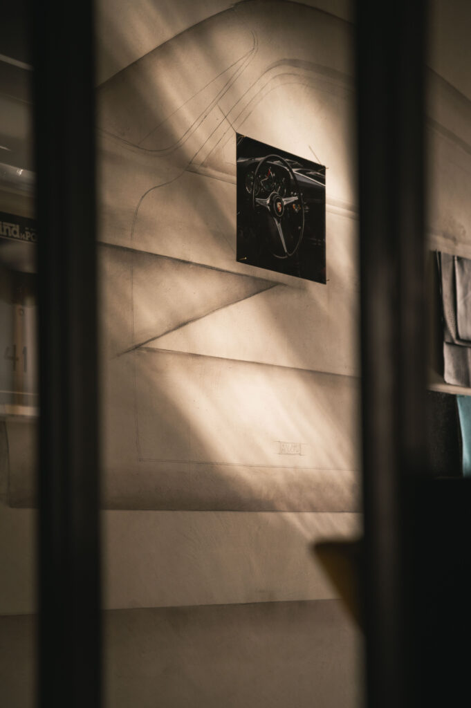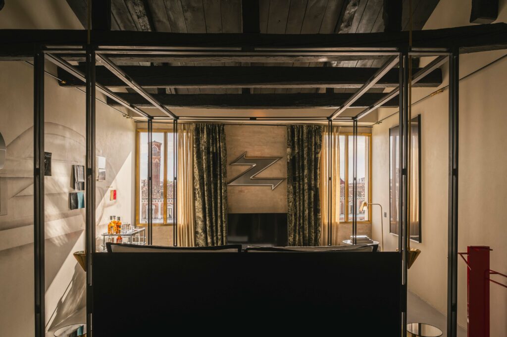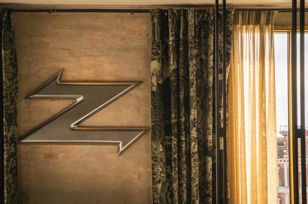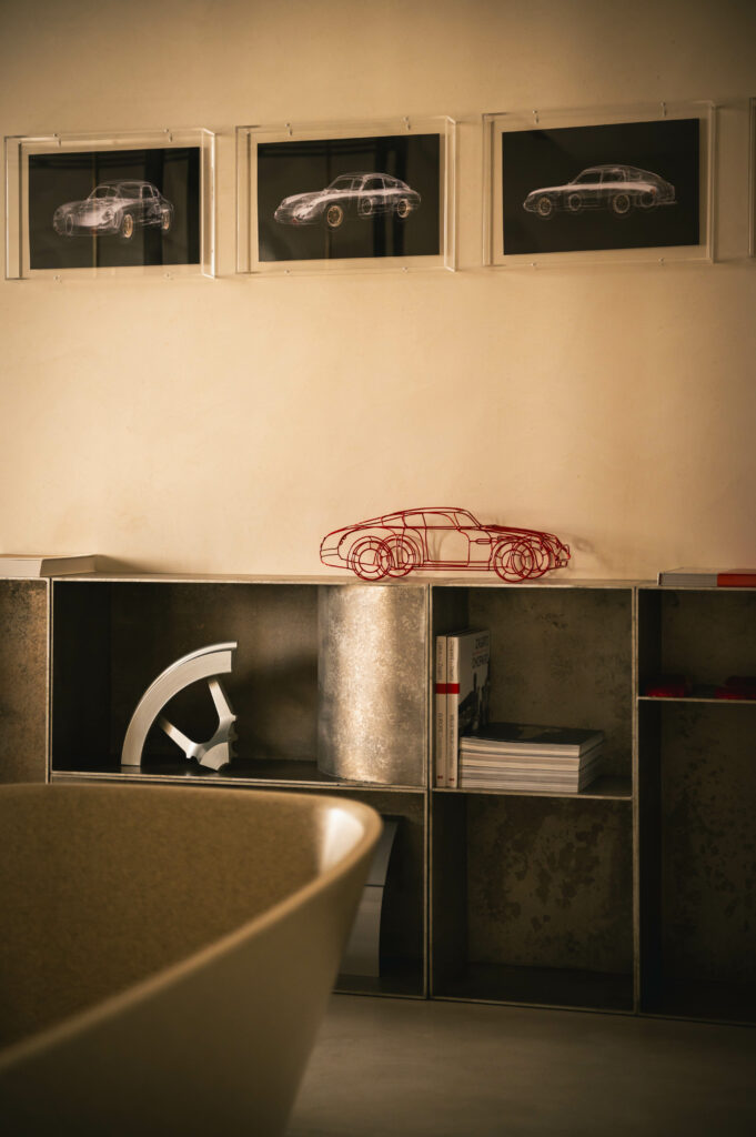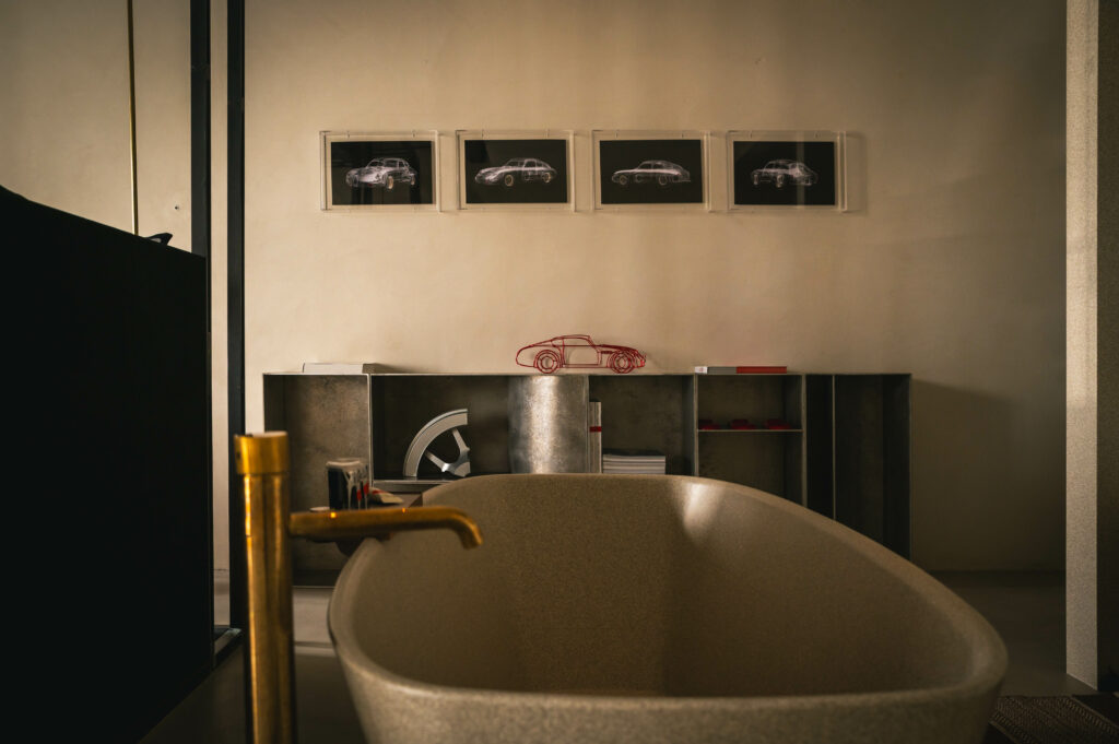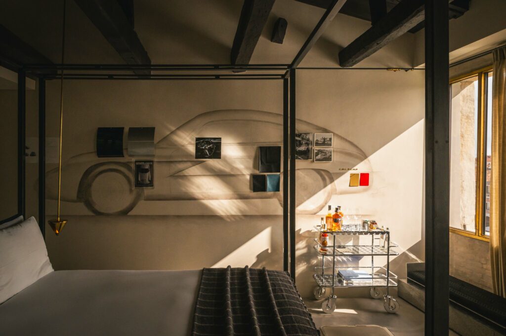 Like a phoenix risen from the ashes of forgotten sketches, the spirit of a legendary automobile breathes anew in this room – a testimony to the art of reimagining. Born from Ferdinand Porsche’s “Italian Job,” the Porsche Carrera 356 B 1600 GTL Zagato Sanction Lost stands as a timeless paragon of masterful craftsmanship and visionary design. A 1:1 scale mural of the car, hand-drawn by Zagato’s Chief Designer, Norihiko Harada, anchors the room’s composition, illuminating the creative odyssey behind this iconic vehicle’s inception. Here, amidst a stunning backdrop of the Grand Canal, guests find themselves immersed in a realm suspended between inspiration and creation, where every element whispers of forms yet to emerge from the mists of imagination.