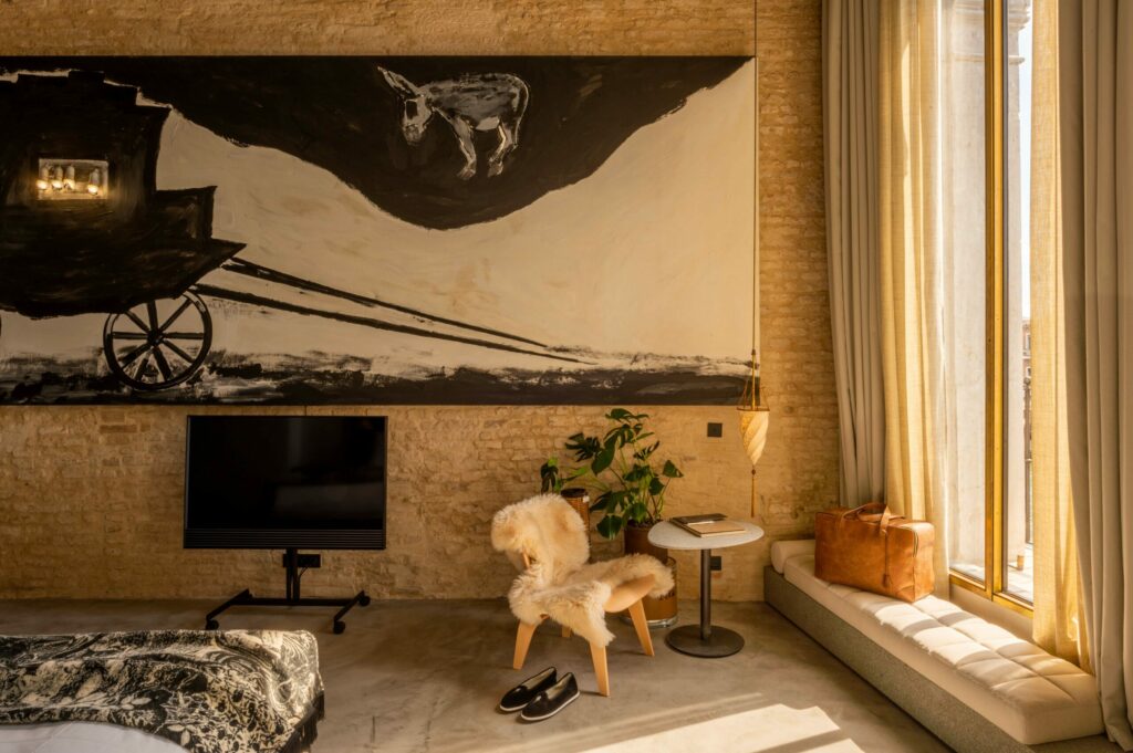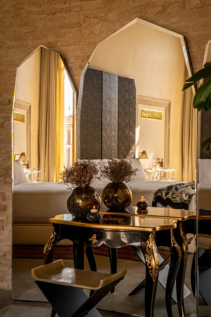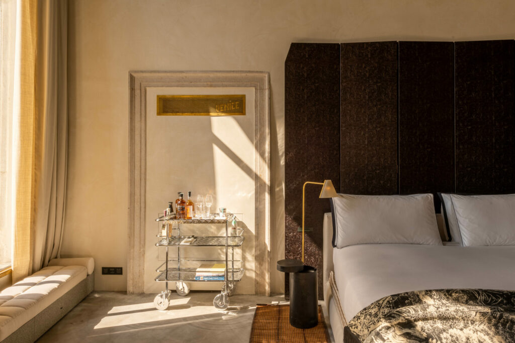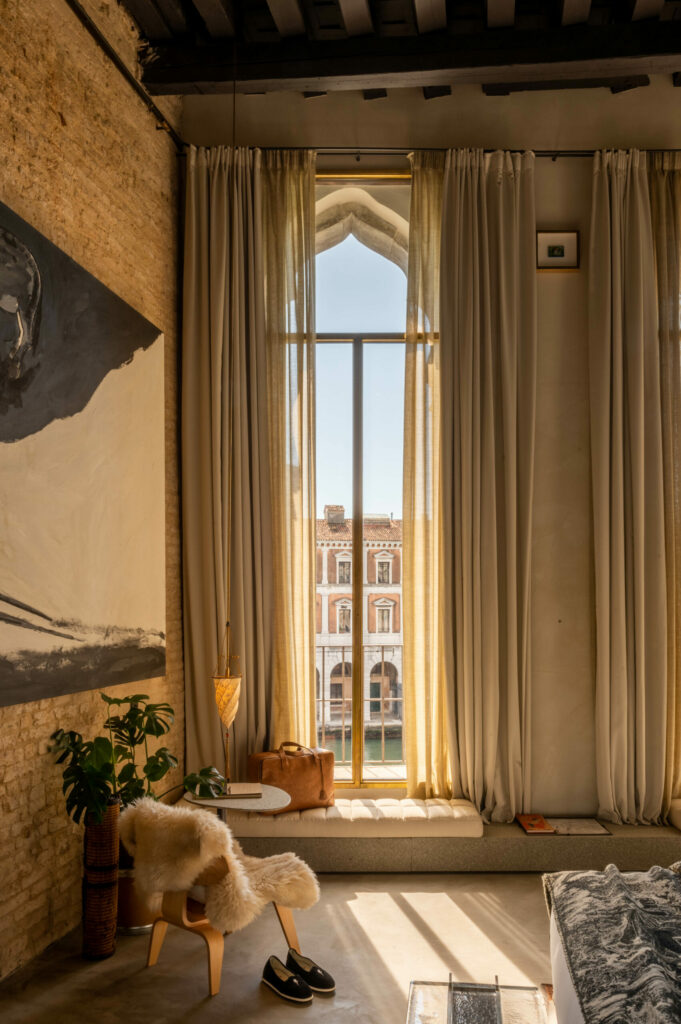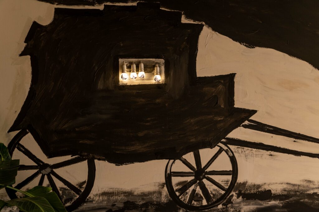 In this lofty space above the Grand Canal, its eternal waters reflecting centuries of innovation, the Transavanguardia movement’s rebellious spirit finds fresh resonance. Framed by soaring windows, the Rialto Bridge stands as a silent witness to the rich, expressive universe of Enzo Cucchi’s “Caro a Trezzi” – an immense, dreamlike canvas where carriage becomes village, and movement becomes dwelling. Here, Venice’s past and future converge in a journey through time and imagination, inviting those who enter to see the city anew through the lens of artistic revolution.